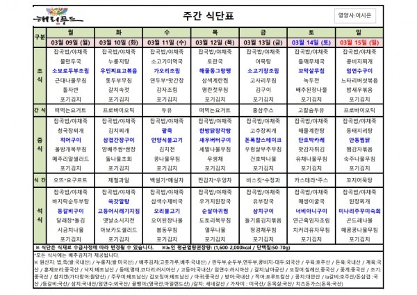 3월 둘째주 식단표 페이지 정보 작성자 은천노인복지회 작성일26-03-06 15:04 조회2,211회 댓글0건 관련링크 이전글 다음글 목록 답변 본문 3월 둘째주 어르신 식단표 안내해 드립니다. 정성과 영양을 담아 준비하겠습니다. 이전글 다음글 목록 답변