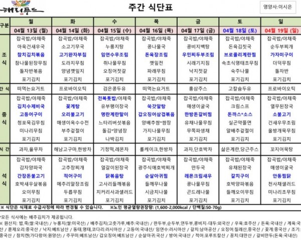 4월 둘째주 식단표 페이지 정보 작성자 은천노인복지회 작성일26-04-14 14:54 조회38회 댓글0건 관련링크 다음글 목록 답변 본문 4월 둘째주 어르신 식단표 안내해 드립니다. 정성과 영양을 담아 준비하겠습니다. 다음글 목록 답변