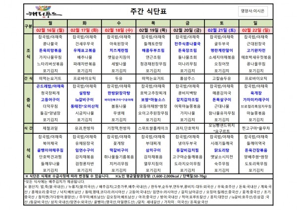 2월 셋째주 식단표 페이지 정보 작성자 은천노인복지회 작성일26-02-12 17:43 조회3,667회 댓글0건 관련링크 이전글 다음글 목록 답변 본문 2월 셋째주 어르신 식단표 안내해 드립니다. 정성과 영양을 담아 준비하겠습니다. 이전글 다음글 목록 답변