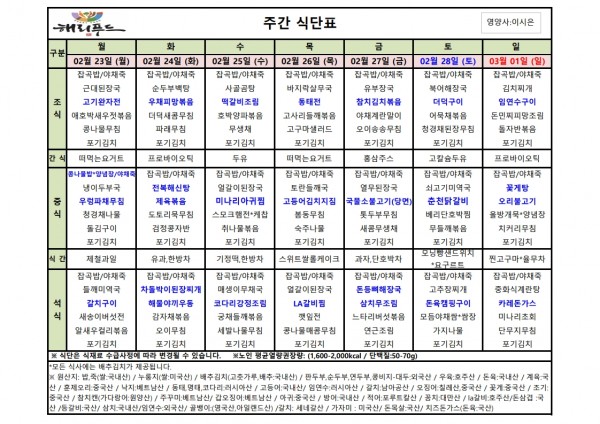 2월 넷째주 식단표 페이지 정보 작성자 은천노인복지회 작성일26-02-20 16:17 조회3,340회 댓글0건 관련링크 이전글 다음글 목록 답변 본문 2월 넷째주 어르신 식단표 안내해 드립니다. 정성과 영양을 담아 준비하겠습니다. 이전글 다음글 목록 답변