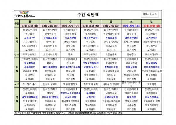 3월 넷째주 식단표 페이지 정보 작성자 은천노인복지회 작성일26-03-20 16:40 조회796회 댓글0건 관련링크 이전글 다음글 목록 답변 본문 3월 넷째주 어르신 식단표 안내해 드립니다. 정성과 영양을 담아 준비하겠습니다. 이전글 다음글 목록 답변