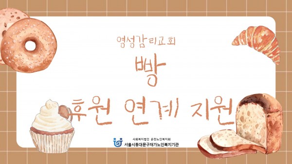 [재가노인지원서비스] 2026년 3월 영성감리교회(빵) 후원 페이지 정보 작성자 은천노인복지회 작성일26-04-06 11:18 조회5회 댓글0건 관련링크 이전글 다음글 목록 답변 본문 기관 인근에 위치한 '영성감리교회'에서 빵(단팥, 소보로, 완두앙금) 200개를 후원해주셨습니다. 이전글 다음글 목록 답변